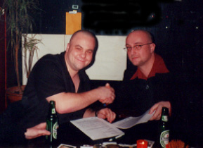 Anbei ein Foto von der Vertragsunter- zeichnung am 17.03.2001 im Berliner KATO-Club. Links der Herr Hoyda, rechts Alexander "Labelfatzke" Ertner von MOONSTORM RECORDS.