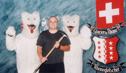 In der Eishöhle des Rhone-Gletschers begrüßten ihn Kunstobmann Eduard Flüdi (rechts) und als Vertreter des Schweizer Musikerkollektives Lacrimosa-Star Thilo Wolf (links). Hoyda bekam den Schweizer Ehrenpickel in Silber überreicht. Die Freude war groß.